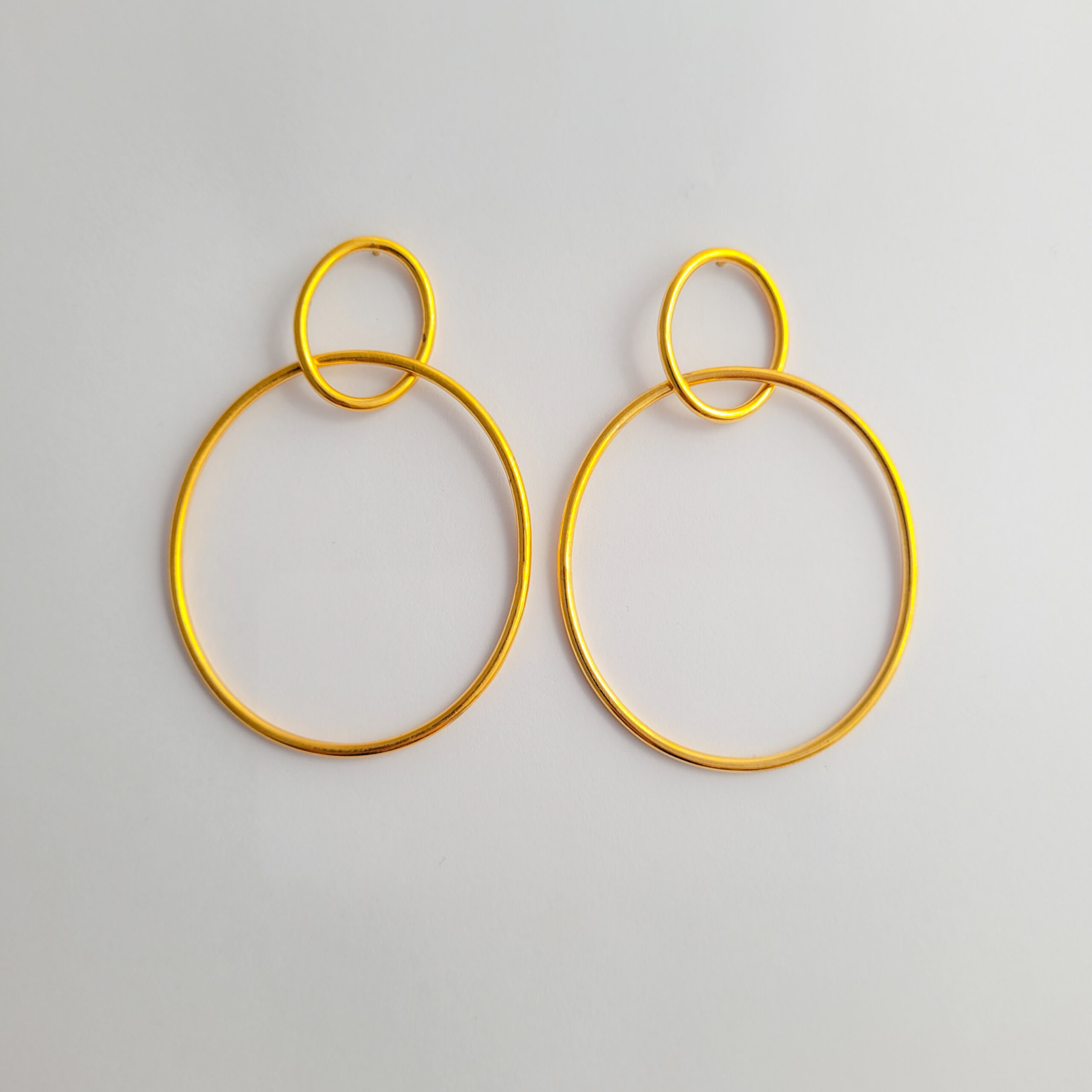 Pendientes maxi 2 ovales unidos entre si, latón bañado en oro de 18k.Miden 70mm de largo ,oval pequeño 20mm,oval grande 4,5mm